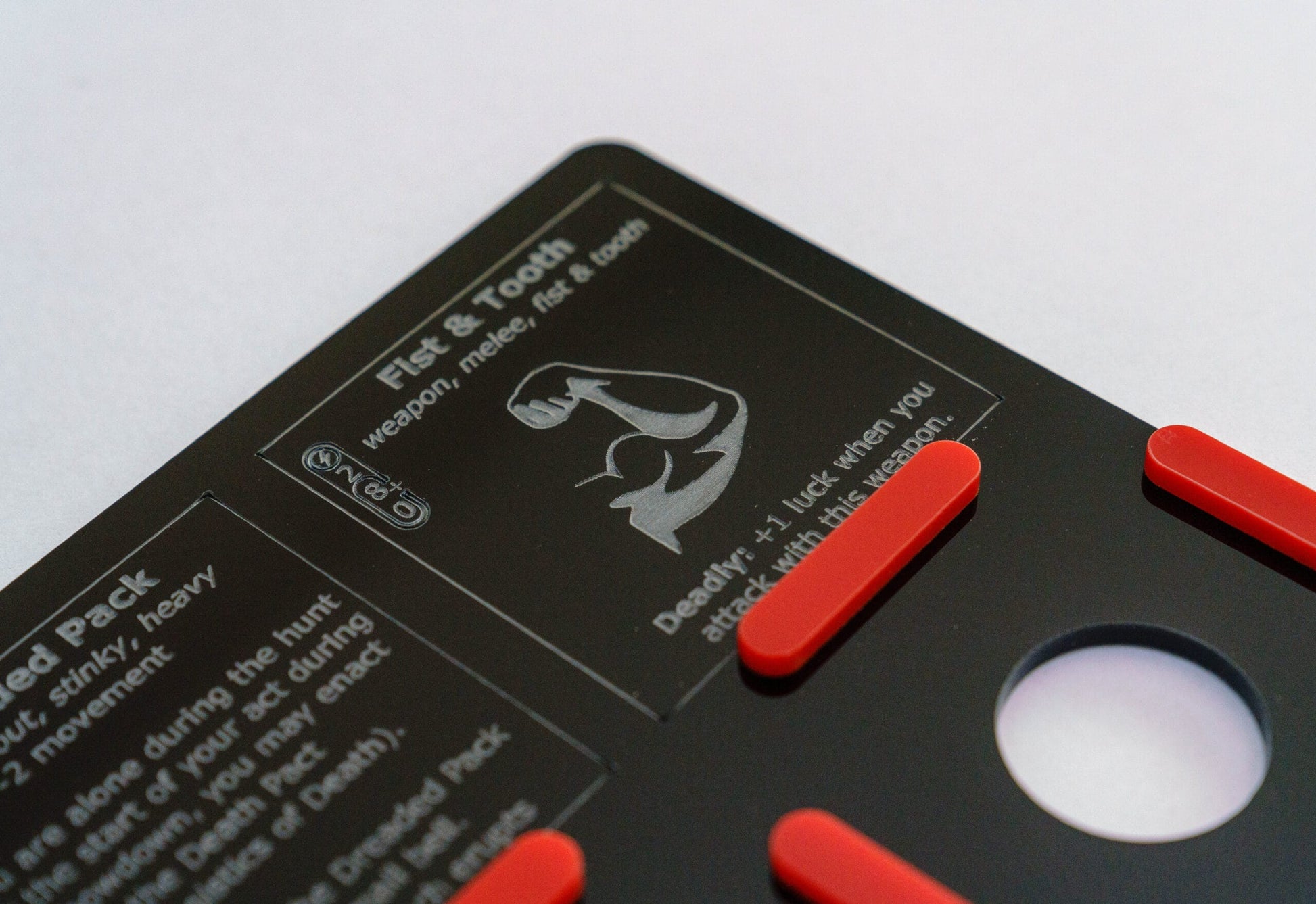 The Scout Gear Grid is available in extended version that include the details for Fist & Tooth and the Dreaded Pack. You can pick from either a landscape layout, where these details are engraved on the left of the grid, or a portrait layout where they are engraved at the top.